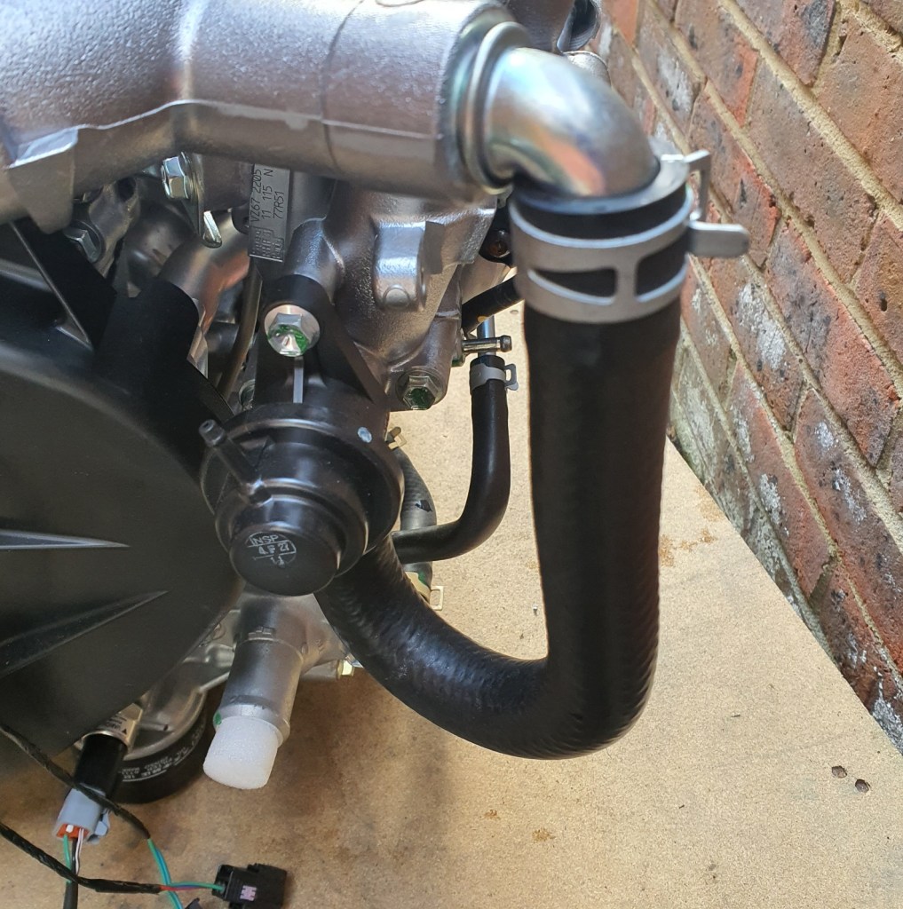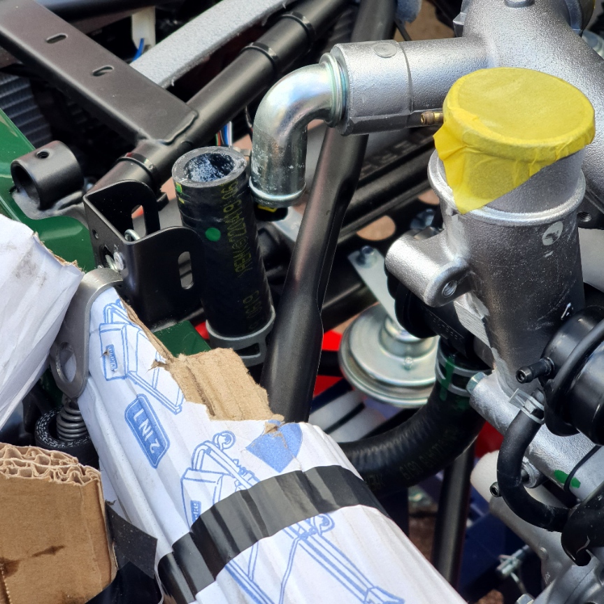 The Assembly Guide indicates that you need to remove something from the front of the engine, but I am pretty sure the component it highlights is incorrect. There is a section of hose at the front LHS that needs to loop around the chassis framework so it is this that has to be removed first and then re-connected.