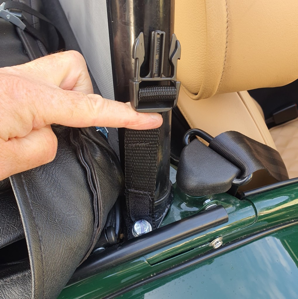 The back straps just pass through the roll bar backstay fixings by passing the strap from below. Two minute job. The side straps need to be fixed to the rollbar hold down bolts but that was equally easy. Once the straps were installed, it was easy to put up the half hood – it’s a lot simpler than the full hood. The transparent panel in the back also means that my high level brake light is visible too.