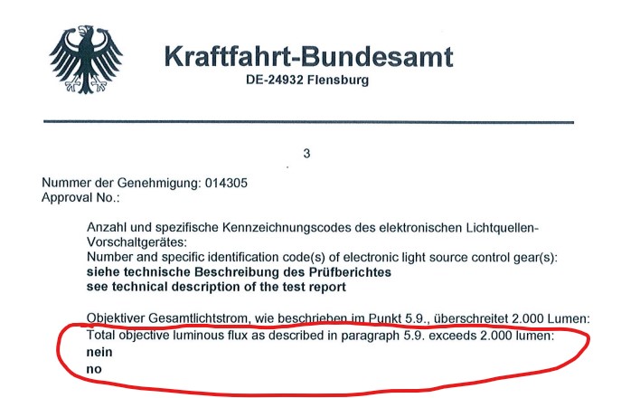 The other hiccup was the LED headlights, which are the standard Caterham upgrade ones (the same as Just Add Lightness sell I think). The testers needed to see some proof that they were less than 2000 Lumens (a new regulation apparently). A few phone calls to the factory allowed me to track down the necessary piece of paper, see below, which was quickly emailed to me and that satisfied the testers. Phew.