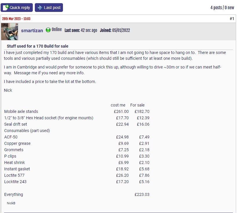 With space limited in my garage, I have decided to sell on quite a lot of the special tools and the partially-used consumables. I advertised on the Club website and was able to find a buyer fairly quickly who took the axle stands, seal drift set, 3/8″ hex drive, along with the the ACF-50, copper grease, loctite, instant gasket, spare P clips etc.