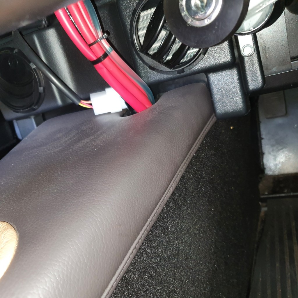 I had been keeping these wedges, which are used in the installation of laminate flooring, for at least 20 years because ‘they were going to be useful one day’. The wedges hook into the gap between the tunnel cover and the carpet. That means that the storage box can be easily unhooked if necessary.